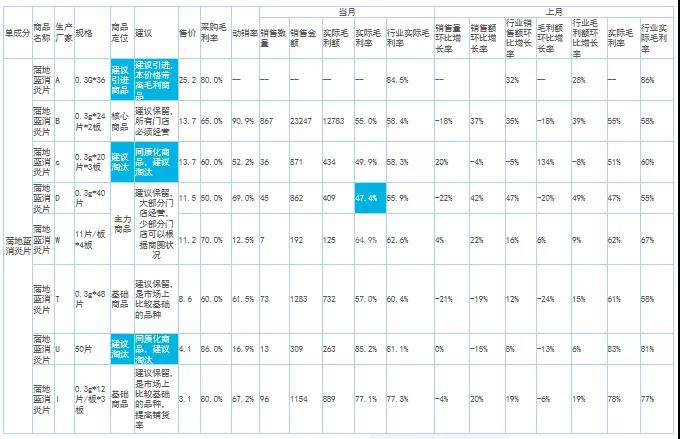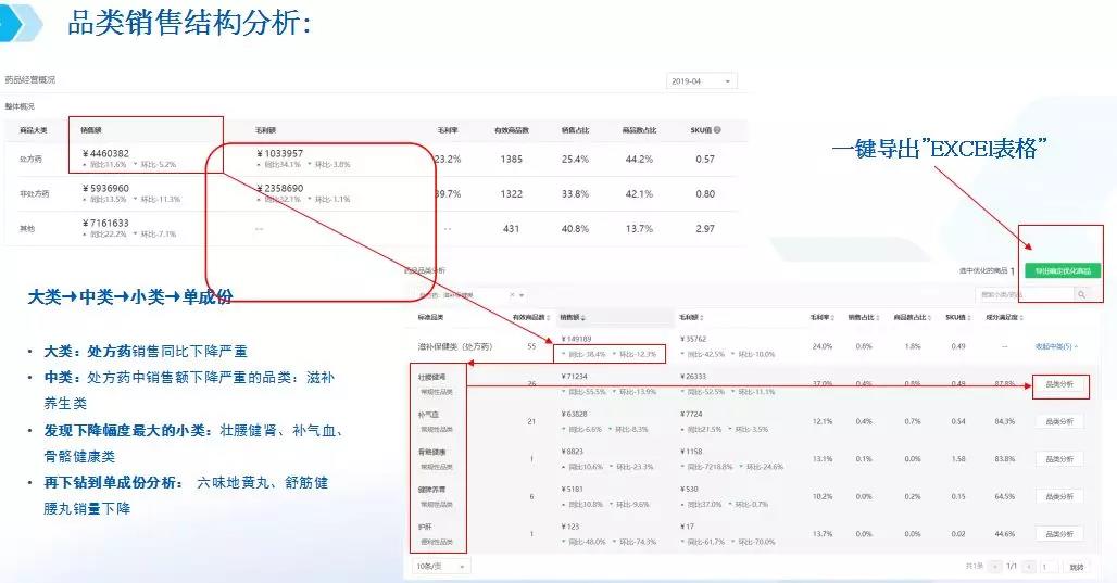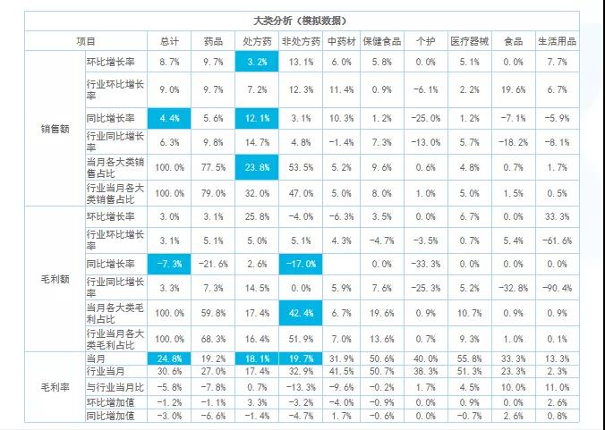 大類分析主要看整體銷售結(jié)構(gòu),找出核心大類的增長機會點。例如,這組數(shù)據(jù)中不管是整體毛利率還是銷售額增長率,都低于行業(yè)均值。細分處方藥、非處方藥及中藥等品類的情況可以看出,處方藥的同環(huán)比銷售額以及銷售占比均低于行業(yè)值,而毛利率卻高于行業(yè)值?梢缘贸觯瓿踔贫ㄌ幏剿帪楹诵脑鲩L大類的策略沒有落地。所以,接下來做中類、小類跟單成分分析的時候需要進行針對性監(jiān)控。