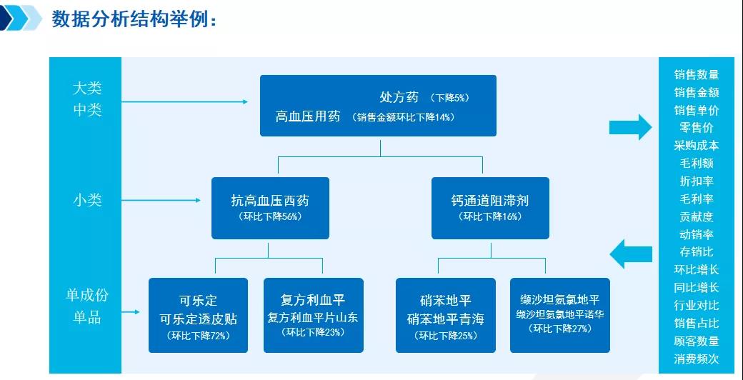 得出分析結(jié)果,提升方案就唾手可得了嗎?并不!確定了核心增長品類之后,需從整體到大類、中類、小類、單成分單品進行抽絲剝繭,基于多維逐層分析,最后才能精準地制定出提升方案。